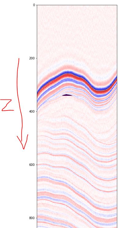 There is some confusion here. Z index 0 is the top, Z index 1250 is the bottom. Double-check this by plotting the data. The top of the model is effectively the surface of the ocean, jut like seismic data used in the geosciences.
